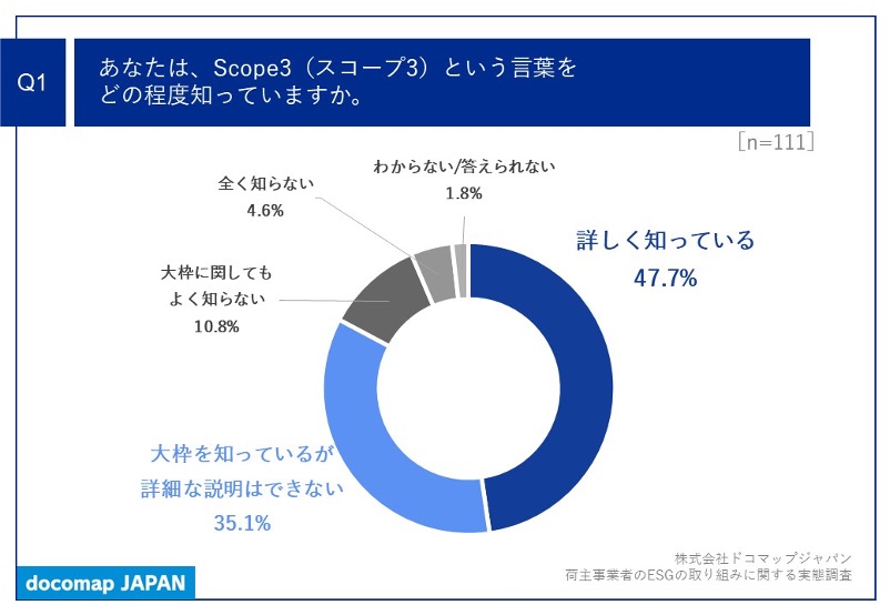 「Q1.あなたは、Scope3(スコープ3)という言葉をどの程度知っていますか。」(n=111)と質問したところ、「詳しく知っている」が47.7%、「大枠を知っているが詳細な説明はできない」が35.1%という回答となりました。