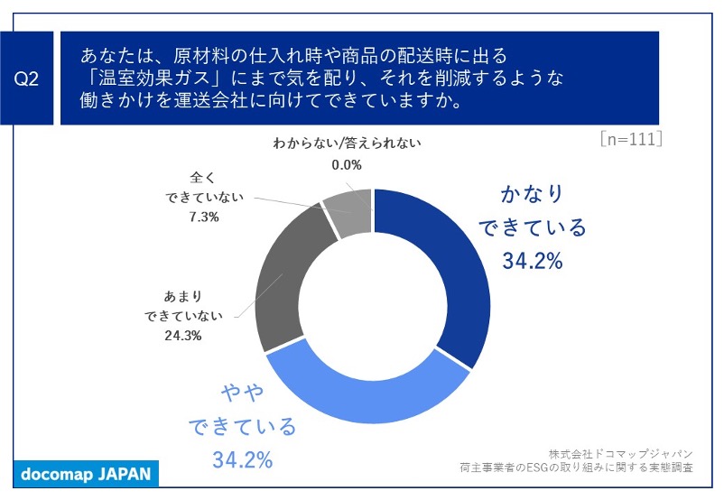 「Q2.あなたは、原材料の仕入れ時や商品の配送時に出る「温室効果ガス」にまで気を配り、それを削減するような働きかけを運送会社に向けてできていますか。」(n=111)と質問したところ、「ややできている」が34.2%、「かなりできている」が34.2%という回答となりました。