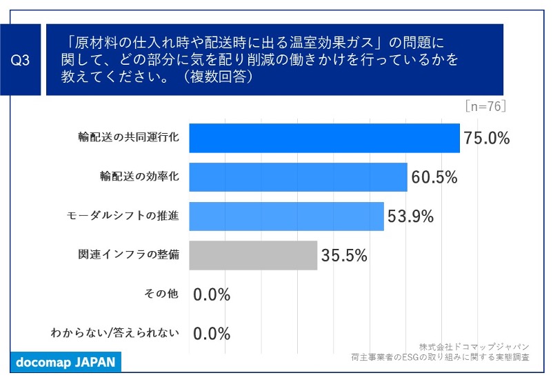 Q2で「かなりできている」「ややできている」を回答した方に、「Q3.「原材料の仕入れ時や配送時に出る温室効果ガス」の問題に関して、どの部分に気を配り削減の働きかけを行っているかを教えてください。(複数回答)」(n=76)と質問したところ、「輸配送の共同運行化」が75.0%、「輸配送の効率化」が60.5%、「モーダルシフトの推進」が53.9%という回答となりました。