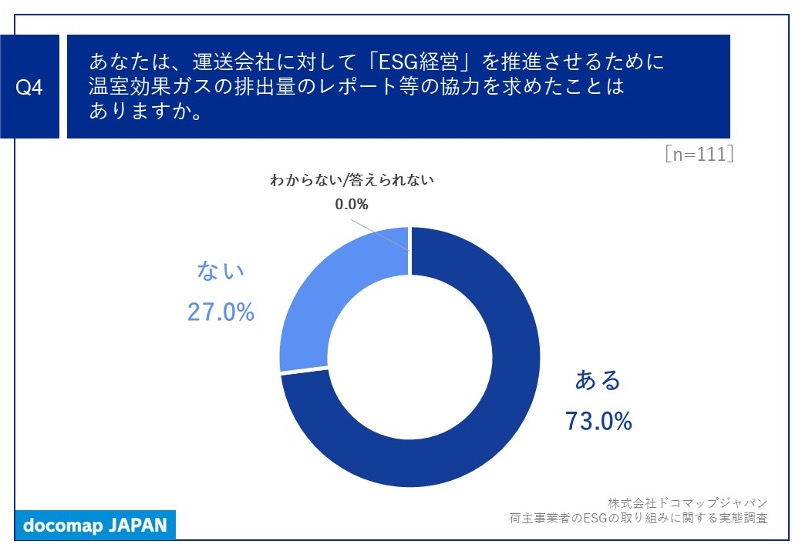 「Q4.あなたは、運送会社に対して「ESG経営」を推進させるために温室効果ガスの排出量のレポート等の協力を求めたことはありますか。」(n=111)と質問したところ、「ない」が27.0%、「ある」が73.0%という回答となりました。