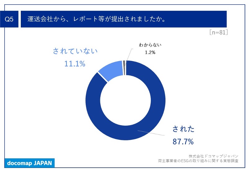 Q4で「ある」と回答した方に、「Q5.運送会社から、レポート等が提出されましたか。」(n=81)と質問したところ、「されていない」が11.1%、「された」が87.7%という回答となりました。