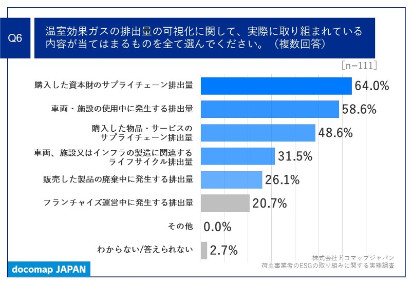 「Q6.温室効果ガスの排出量の可視化に関して、実際に取り組まれている内容が当てはまるものを全て選んでください。(複数回答)」(n=111)と質問したところ、「購入した資本財のサプライチェーン排出量」が64.0%、「車両・施設の使用中に発生する排出量」が58.6%、「購入した物品・サービスのサプライチェーン排出量」が48.6%という回答となりました。