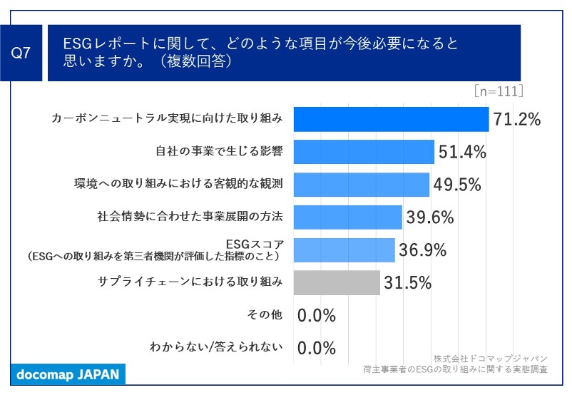「Q7.ESGレポートに関して、どのような項目が今後必要になると思いますか。(複数回答)」(n=111)と質問したところ、「カーボンニュートラル実現に向けた取り組み」が71.2%、「自社の事業で生じる影響」が51.4%、「環境への取り組みにおける客観的な観測」が49.5%という回答となりました。