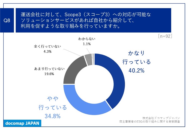 Q1で「大枠を知っているが詳細な説明はできない」「詳しく知っている」と回答した方に、「Q8.運送会社に対して、Scope3(スコープ3)への対応が可能なソリューションサービスがあれば自社から紹介して、利用を促すような取り組みを行っていますか。」(n=92)と質問したところ、「やや行っている」が34.8%、「かなり行っている」が40.2%という回答となりました。