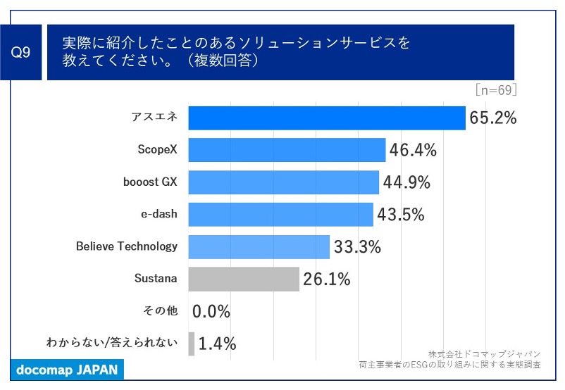 Q8で「やや行っている」「かなり行っている」と回答した方に、「Q9.実際に紹介したことのあるソリューションサービスを教えてください。(複数回答)」(n=69)と質問したところ、「アスエネ」が65.2%、「ScopeX」が46.4%、「booost GX」が44.9%という回答となりました。
