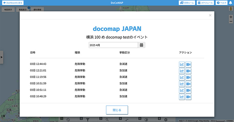 Accurate behavior detection by the G sensor and vehicle speed pulse installed in the OCTLINK device enables detection of hazardous behaviors such as sudden acceleration, sudden deceleration, sudden swerving, and speed monitoring. In addition, when a camera is linked, video of dangerous behavior can be viewed on DoCoMAP at any time.