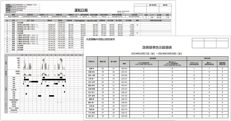 Various reports are automatically generated based on the data acquired by the digital tachograph. The following reports are automatically generated: daily driving report, detailed crew member work performance chart, crew member labor performance, improvement standards notification, detailed operation performance by vehicle, vehicle operation performance table, safe driving report, safe driving performance, safe driving score, and list of fuel consumption.