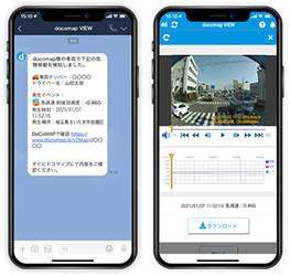 When dangerous behavior such as sudden steering or abrupt acceleration/deceleration are detected, the system automatically uploads 20 seconds of video and audio (12 seconds before and 8 seconds after the event) to the cloud. Uploaded videos can be viewed any time via the DoCoMAP interface.