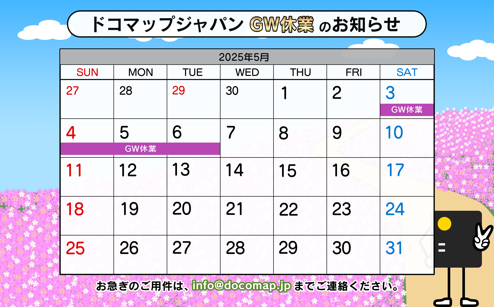 お急ぎのご用件につきましては、info@docomap.jpまでご連絡くださいますようお願い申し上げます。