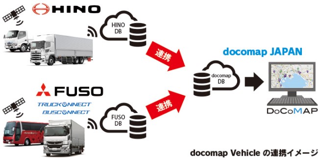 この度、株式会社ドコマップジャパン(本社:東京都港区、代表取締役:浦嶋一裕、以下 ドコマップジャパン)は、2021年11月30日に、日野自動車株式会社(本社:東京都日野市、社長:小木曽聡、以下 日野)との報道発表の通り、日野のコネクティッドトラックと、更に2022年3月23日に三菱ふそうトラック・バス株式会社(本社:神奈川県川崎市、代表取締役社長・CEO:カール・デッペン、以下 三菱ふそう)との報道発表の通り、テレマティクスサービス「Truckonnect®(トラックコネクト)」、「BusConnect®(バスコネクト®)」※1とドコマップジャパンの動態管理システムDoCoMAPとのデータ連携サービスの名称を「docomap Vehicle(ドコマップビークル)」とし、2022年4月より一般向けに提供を開始します。