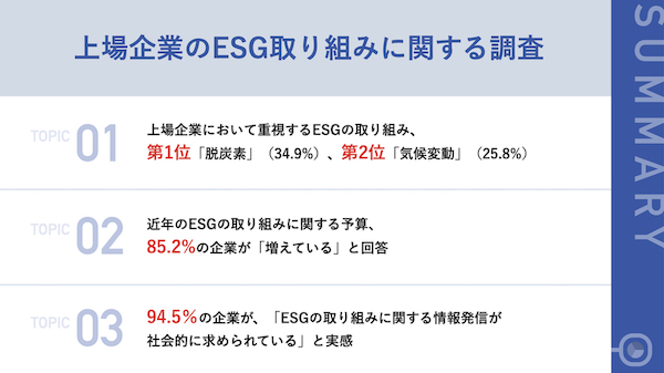 上場企業において重視するESGの取り組み、第1位は「脱炭素」の結果となりました。なお、近年のESGの取り組みに関する予算について、85.2%が「増えている」と回答しており、将来的にもESGの取り組みに関する予算が増えることを想定していることが分かりました。また同時に、94.5%が「ESGの取り組みに関する情報発信が社会的に求められている」と実感しているようです。