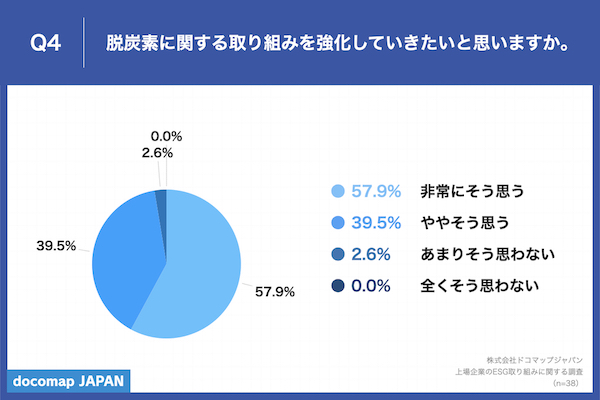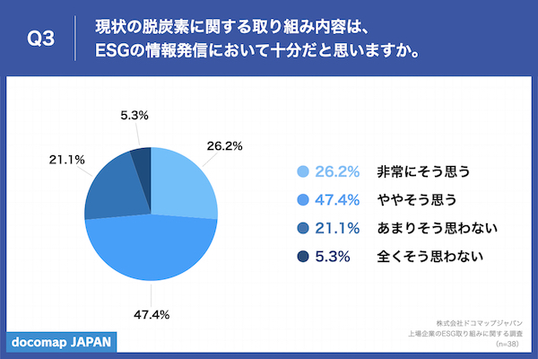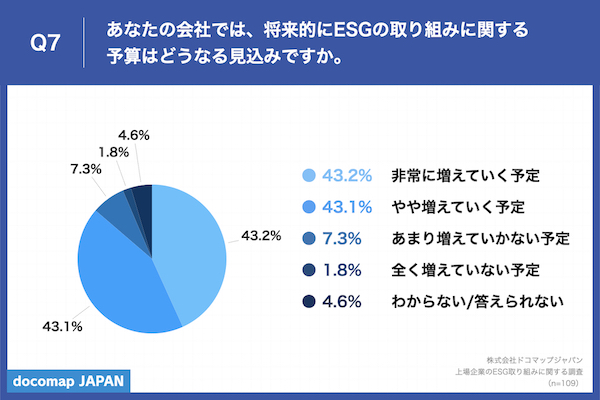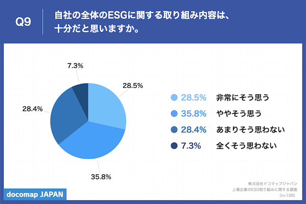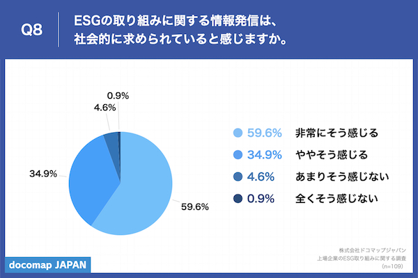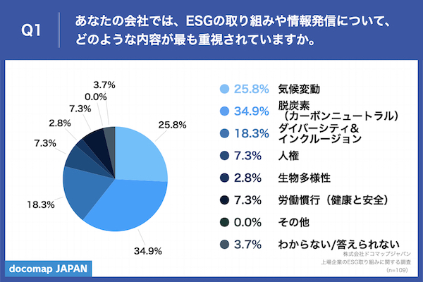 株式会社ドコマップジャパン(東京都港区、代表取締役 浦嶋一裕、以下「ドコマップジャパン」)は、上場企業に勤めており、ESGに関する情報発信の業務に携わっている経営企画・IR・ESG推進室の方109名に対し、上場企業のESG取り組みに関する調査を実施いたしましたので、お知らせいたします。
