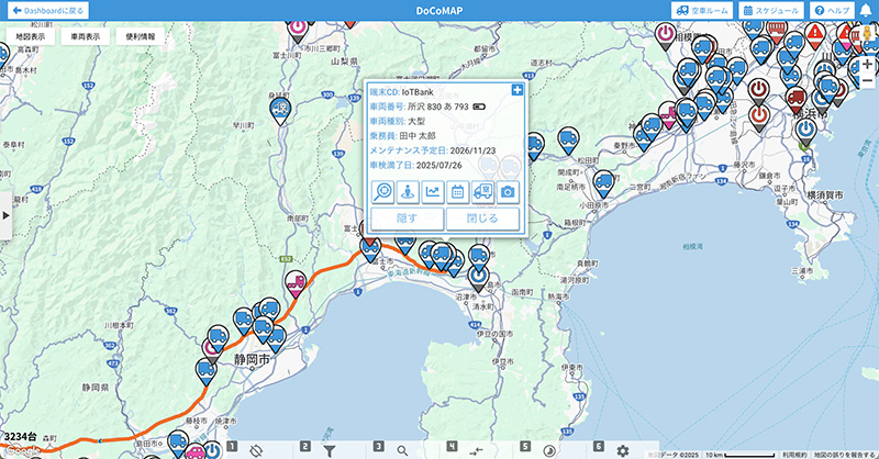 シンプルで分かりやすい管理者専用ページです。端末から送信された位置情報と、専用アプリケーションから送信された運行状況データをクラウド上で管理することができます。さらに、いつでもどこからでもブラウザからDashboardにアクセスすることで確認が可能です。