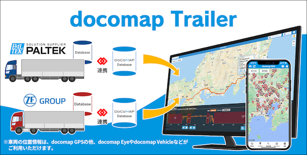 株式会社ドコマップジャパン(本社:東京都港区、代表取締役:浦嶋一裕、以下 ドコマップジャパン)は、2022年12月5日に報道発表した、株式会社PALTEK(本社:東京都港区、代表取締役社長:福田光治、以下 PALTEK)の「GPSトラッカーR」と、2023年1月16日に報道発表した、ゼット・エフ・ジャパン株式会社(本社:神奈川県横浜市中区、代表取締役社長:多田直純、以下 ゼット・エフ・ジャパン)の「SCALAR EVO Pulse(スカラー エボ パルス)」とデータを連携し、ドコマップジャパンの車両位置情報管理システム「DoCoMAP(ドコマップ)」上でトレーラの位置情報が管理できる「docomap Trailer(ドコマップトレーラ)」のサービスを2023年3月より開始します。